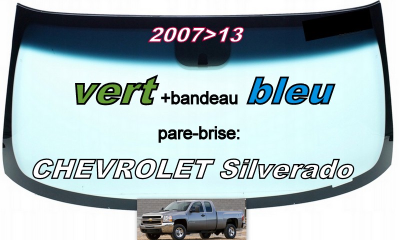 Pare-brise teinté vert +bandeau bleu CHEVROLET SILVERADO-plateforme GMT900-2007/13