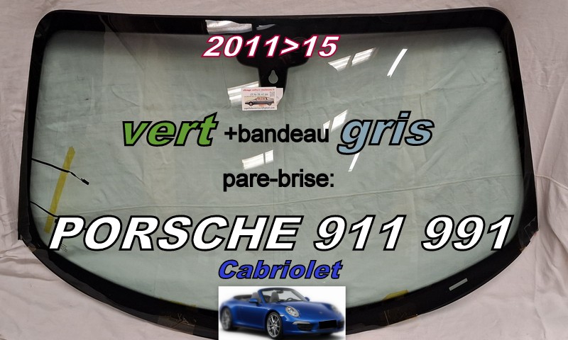 Pare-brise teinté vert +bandeau gris PORSCHE 911 991 Cabriolet-12/2011 à 12/2015